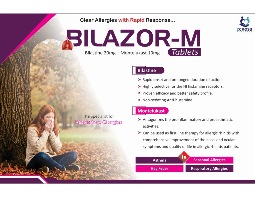 Bilazor-M is a dual-action therapy designed to provide rapid and long-lasting relief from respiratory and seasonal allergies. By combining Bilastine, a potent non-sedating antihistamine, with Montelukast, a leukotriene receptor antagonist, Bilazor-M effectively controls allergic rhinitis, asthma-related symptoms, and other allergy-induced conditions.
