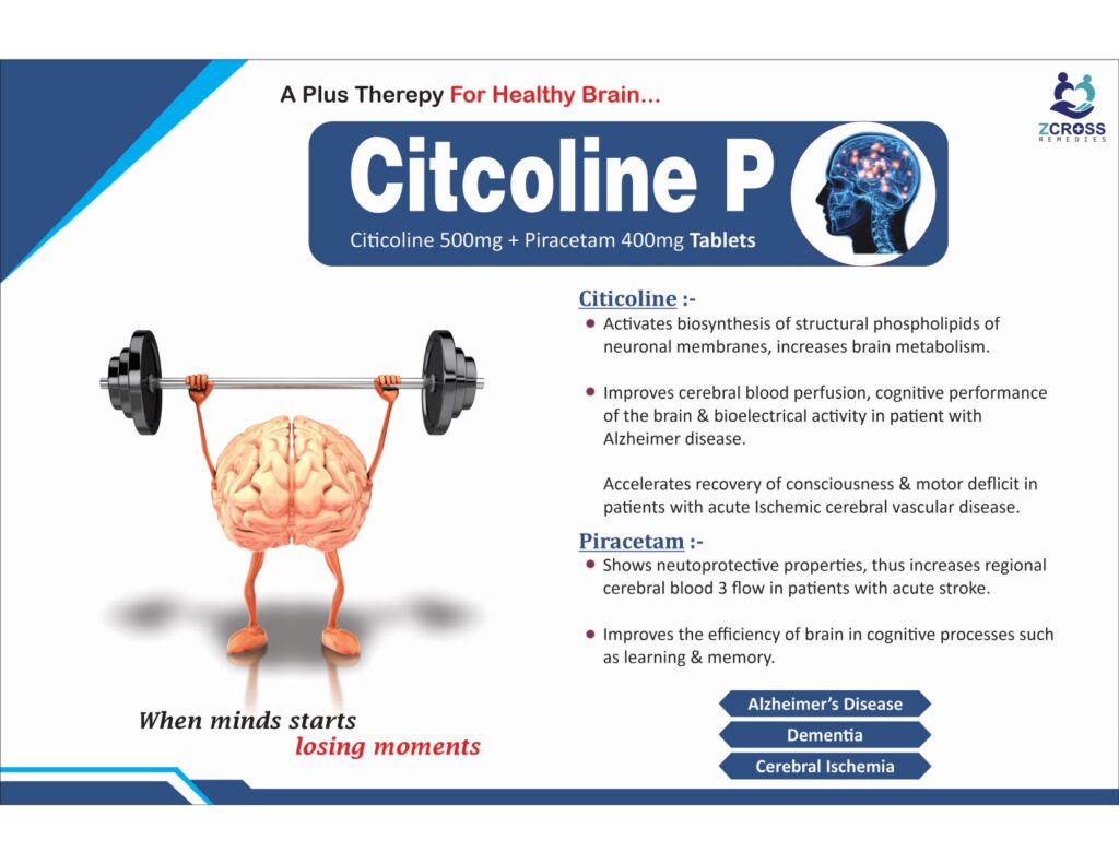 Citcoline P is a neuroprotective and neuroenhancing therapy designed to support brain health, memory, and cognitive function. The combination of Citicoline and Piracetam provides synergistic action in improving cerebral metabolism, enhancing blood flow, protecting neurons, and aiding recovery in neurological disorders such as Alzheimer’s disease, dementia, and cerebral ischemia.