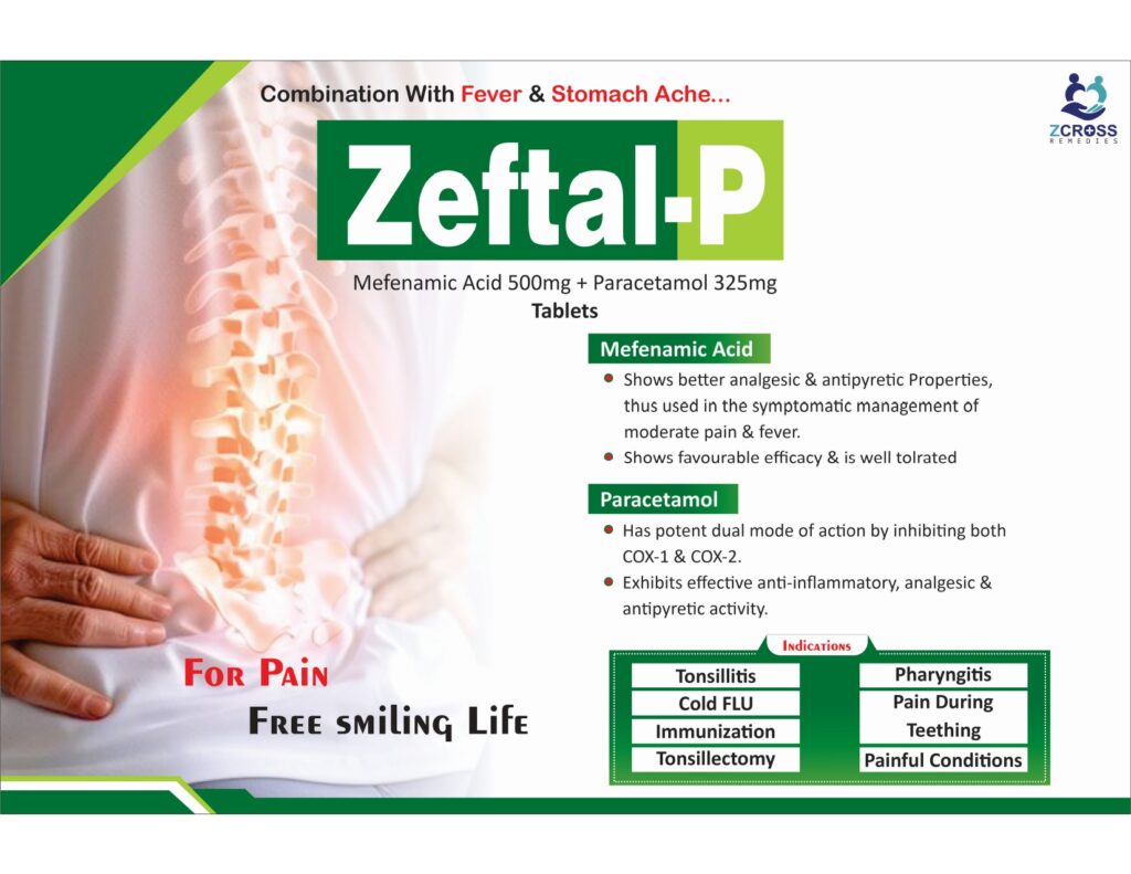 Zeftal-P is a combination analgesic and antipyretic medicine formulated with Mefenamic Acid and Paracetamol. This combination provides rapid relief from pain and fever while also addressing inflammation. It is especially useful in tonsillitis, pharyngitis, cold and flu symptoms, immunization pain, teething discomfort, and other painful conditions.