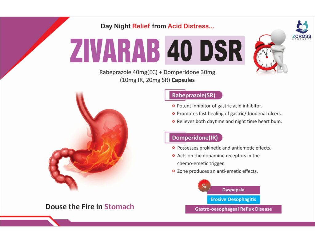 ZIVARAB 40 DSR is a dual-action gastro-protective formulation designed to provide day and night relief from acid distress. By combining Rabeprazole (a proton pump inhibitor) with Domperidone (a prokinetic and antiemetic agent), it effectively manages hyperacidity, reflux, and associated gastric discomforts.